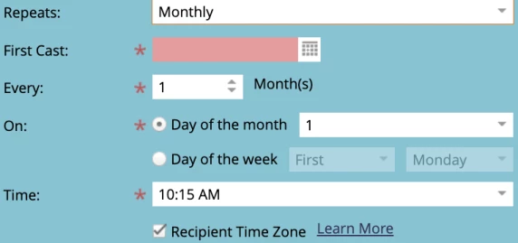 - On a monthly basis, every X number of months, on a particular day of the month or day of the week, at a fixed time