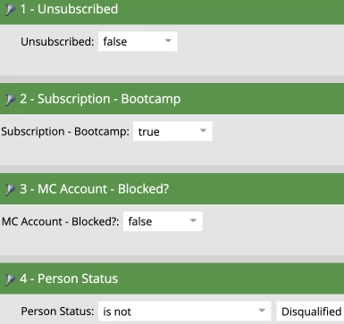 - A “Not Was Sent Email” filter selecting the corresponding email asset that this smart list is made for