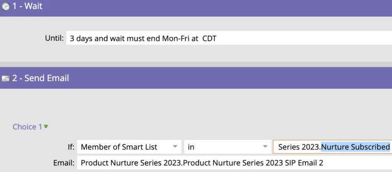 Since we have waited a few days since requesting this second campaign we need to check that the person is still in the “Nurture Subscribed” list before sending the email and requesting the next campaign. This is done using choice steps in the “Send Email” and “Request Campaign” actions (see video above).