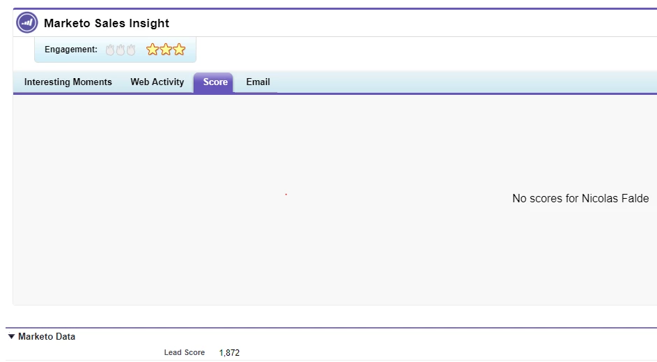 I'm just starting to wrap my head around our Marketo Sales Insight experience in Salesforce. As you can see on the image below this person has a lead Score of 1,872 but it's not showing me the activity on the Score tab.