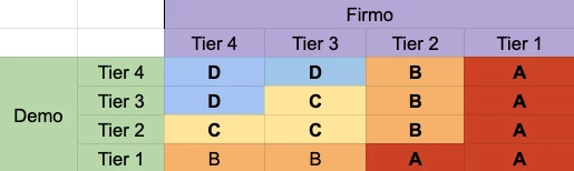The formula to calculate the demographic or firmographic tier based on the computed percentage total is: