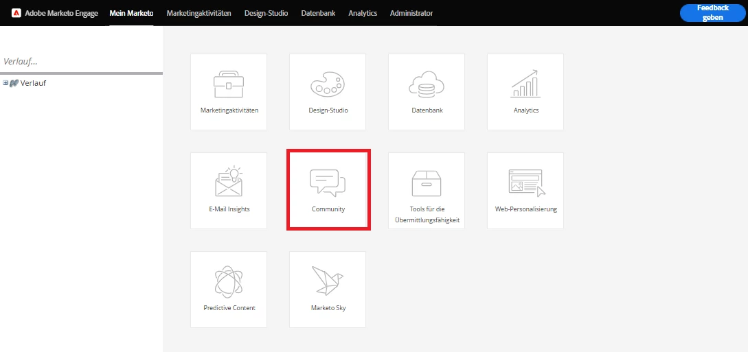 Hier finden Sie die Community-Homepage. Klicken Sie alternativ auf die Community-Kachel auf der Startseite, sobald Sie in Ihrer Marketo-Engage-Instanz angemeldet sind.