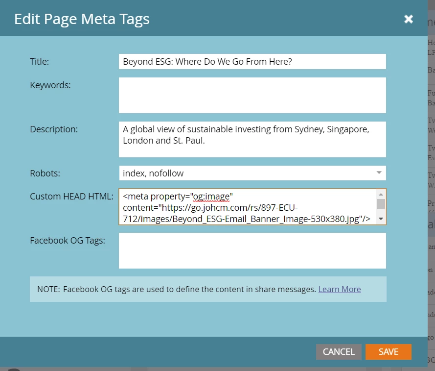 When someone shares the link to one of our Marketo landing pages on LinkedIn (https://go.johcm.com/WBN-2021-06-23-1056-Beyond_ESG-GM_LP-Registration.html), the images/titles and descriptions are not pulling in correctly. I've updated the meta tags as follows and it's still not working. Any ideas?