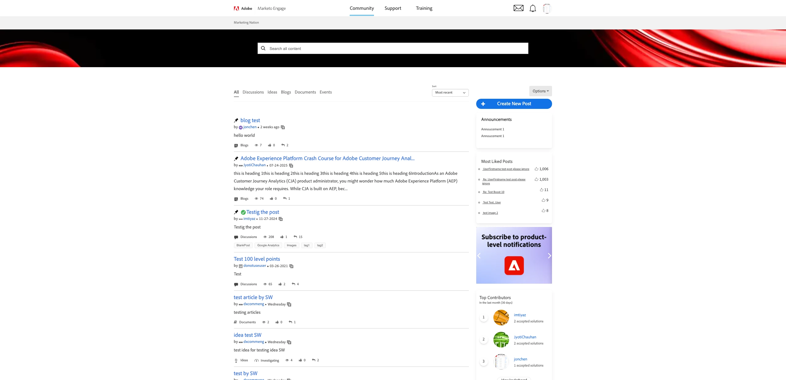 - Redesigned Content Tabs: The content tabs now feature a softer, more refined appearance to reflect the Experience League Community. Announcements and popular blog post sections maintain their spots on the sidebar with a refreshed look.
