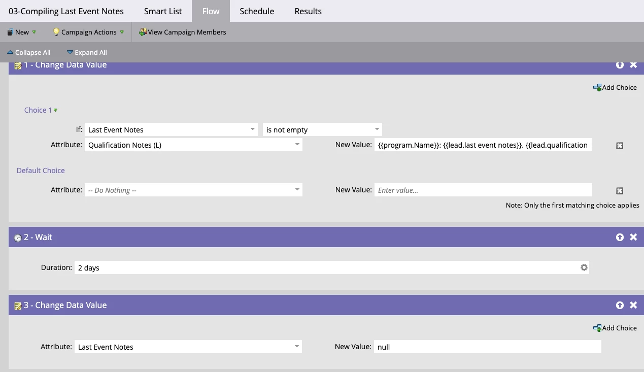 So here's what I'm trying to figure out: I have a field I use on the lead object to upload new field event notes called "last event notes". With every event that we upload, any new notes go to this field and with that comes the problem of losing previous notes - because the last event notes field is overwritten on upload. To get rid of this problem, I am trying to put together a global trigger that detects when new data is added to the last event notes field and adds those notes to a more permanent notes field called "qualification notes". To help keep track of where the notes in "qualification notes" came from, I want the trigger flow so that it will not only move the last event notes into qualification notes, but it will also add the program title to the front of those new notes and also keep any previous notes already in qualification notes. I have tried to put it together like the screenshot below, but due to the nature of how I have it set up, the program name token will only apply the name of the program the smart campaign exists in. I don't want the smart campaign to have to appear in every single program we put together and I would rather have it be in one spot while working for all programs. So I'm wondering how I can make this flow work as I've described. Any thoughts?