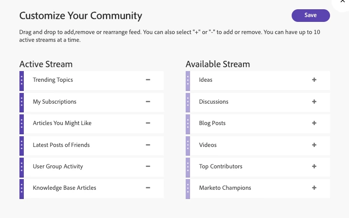 Depending on your preference, you can add, remove, or reorder the categories in your customized community feed by clicking on the “+” button at the top of the Dashboard. A lightbox will pop up where you can drag and drop categories to add or remove them from your Active Stream. You can also order the categories in your Active Stream to ensure your favorites show up at the top! Experiment with categories and feed order to create the best dashboard for you. Please keep in mind that the maximum number of categories in your dashboard is 10.