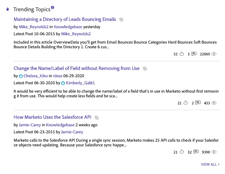 - Knowledge Base Articles: Read the latest Knowledge Base articles written by the Marketo Engage Support Team.