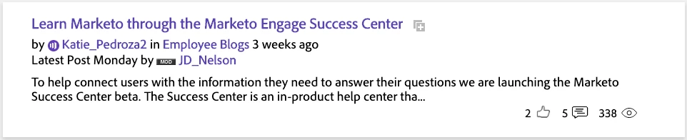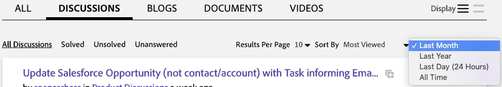 We also added additional controls for Discussion type posts. You’ll notice that the Discussions tab has new sorting options that allow you to filter discussions by Solved, Unsolved, and Unanswered. While solved questions have an answer already marked by the question author or moderator, unsolved questions are defined as threads that do not have an accepted solution, and unanswered questions are defined as threads that do not have any replies. This addition makes it even simpler to identify verified solutions. And, it helps the Marketo gurus out there find questions that need an answer!