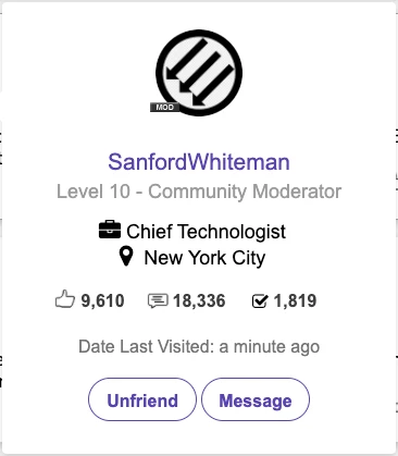 Curious about your peers and what they’re doing? To more easily view a fellow Community members’ information, we’ve added profile hover cards for all members. By hovering your cursor over a username hyperlink anywhere in Community, you can see a user’s level, title and location (if stated), date last visited, total # of received likes, posted topics/replies, and accepted solutions. You can also friend or message a user directly from their profile hover card.