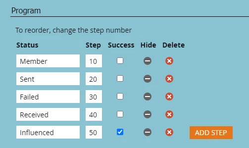 Similarly, people already in the Received status before it's marked as success status wouldn't be considered as being reached the program success , as similar to the earlier case - "Program Success" boolean field is not retroactively updated to TRUE to match the channel's success staus in-case it is changed later. The changes to the channels/success status are forward looking, i.e., future program members reaching the Received status would be marked as success, and those reaching the Influenced status would not be marked as success.