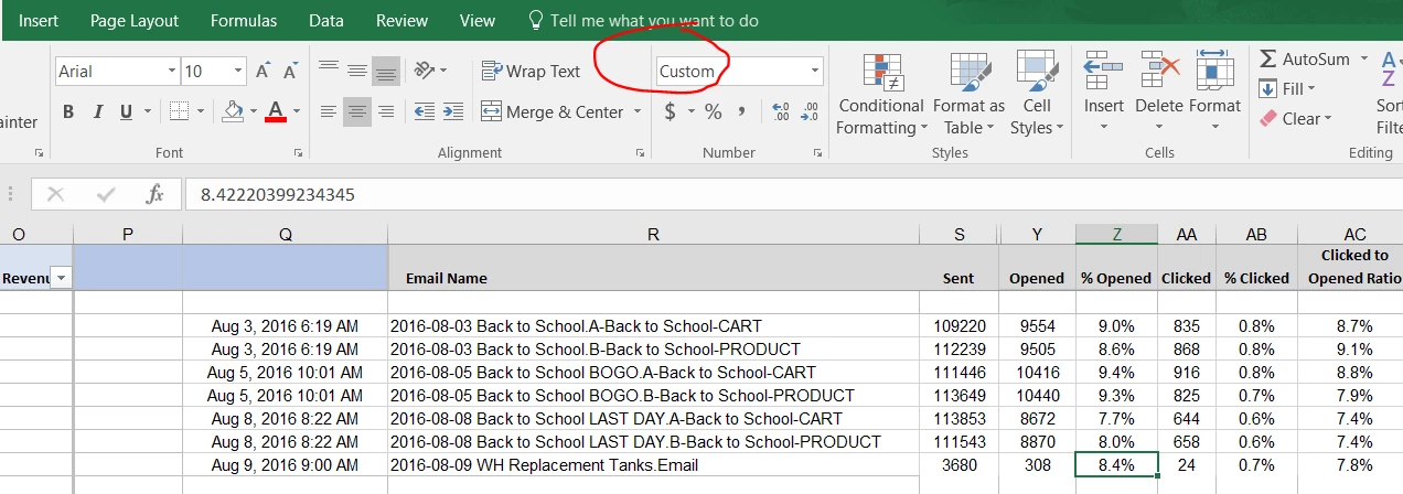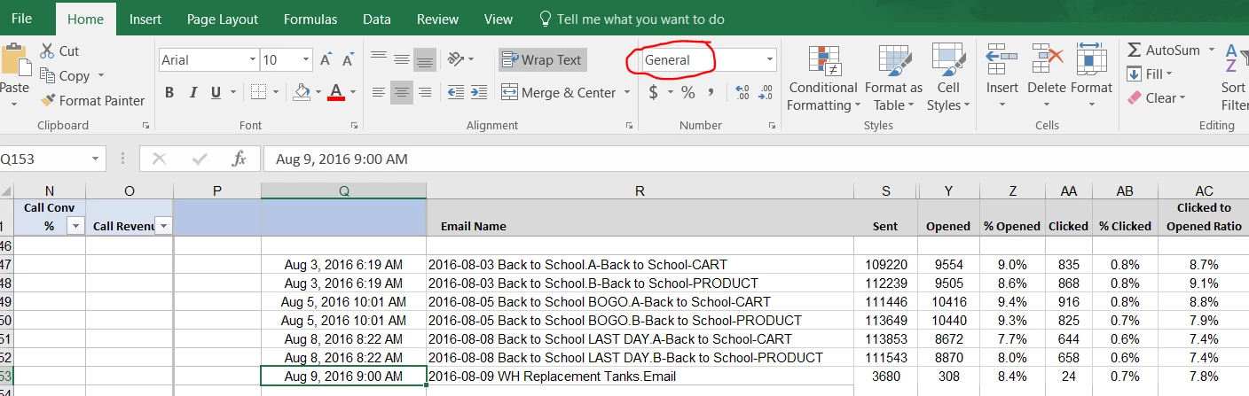 Every time I export my email performance reports and I copy/paste the rows into my "Master" excel spreadsheet with all of my different emails in it - all of the number formats get messed up. The long numbers don't have commas when they are in the thousands. Percentages aren't a percentage number format, so I can't sort my percentages... and dates aren't a date format, so I can't sort my date. I have to double click each day to get the field in Excel to turn into a date. All percentages, I have to re-type the percentage because a 99.9% will turn into 999.9% when I click % in the "number formatting" area in Excel.