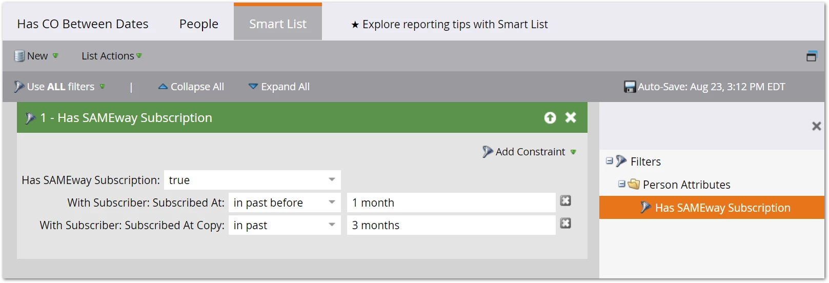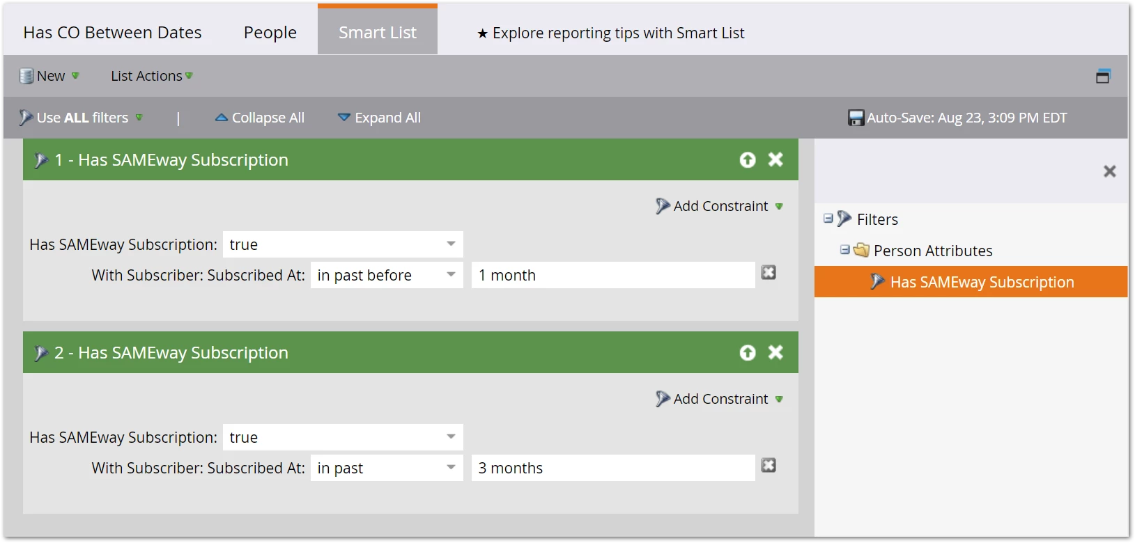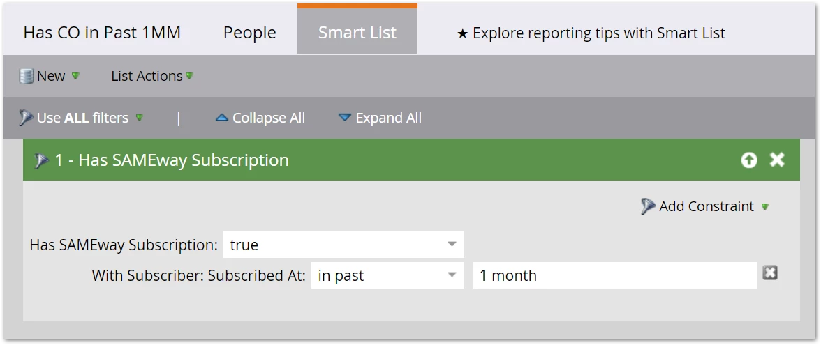 This could includepeople who subscribed to a newsletter within the last month, as long as they subscribed to another newsletter more than a month ago. Filter 1 and Filter 2 aren’t looking at the same record, they’re looking at the whole CO list. Make sense?