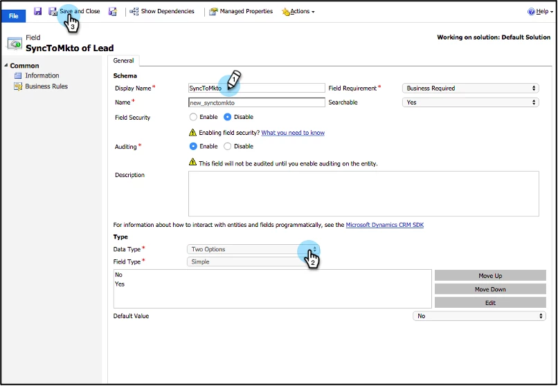 Note: It is a best practice to create this field on at least the Lead and Contact entities. You can also create the field on the Account, Opportunity and any Custom Entities to control individual records for these entities as well. If you don’t, all records associated to a synced Lead or Contact will automatically sync down.
