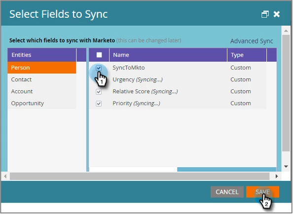 Check the box next to SyncToMkto for each of the available entities and click Save