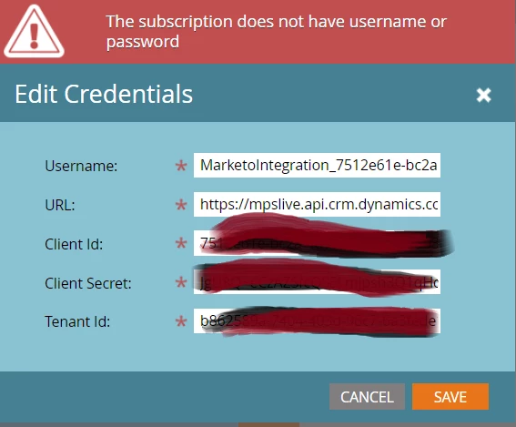 Marketo-D365 initial sync setup issue - ERROR : The subscription does not have username or password.