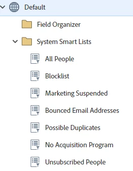 - Next, it's important to look at the system smart lists in each of the partitions in the database and document the # of people in each SL. They're super helpful and important, Marketo wouldn't have them create OOTB if they weren't important. I suggest going through these SLs before making your check-up SLs reports for further in-depth database auditing.