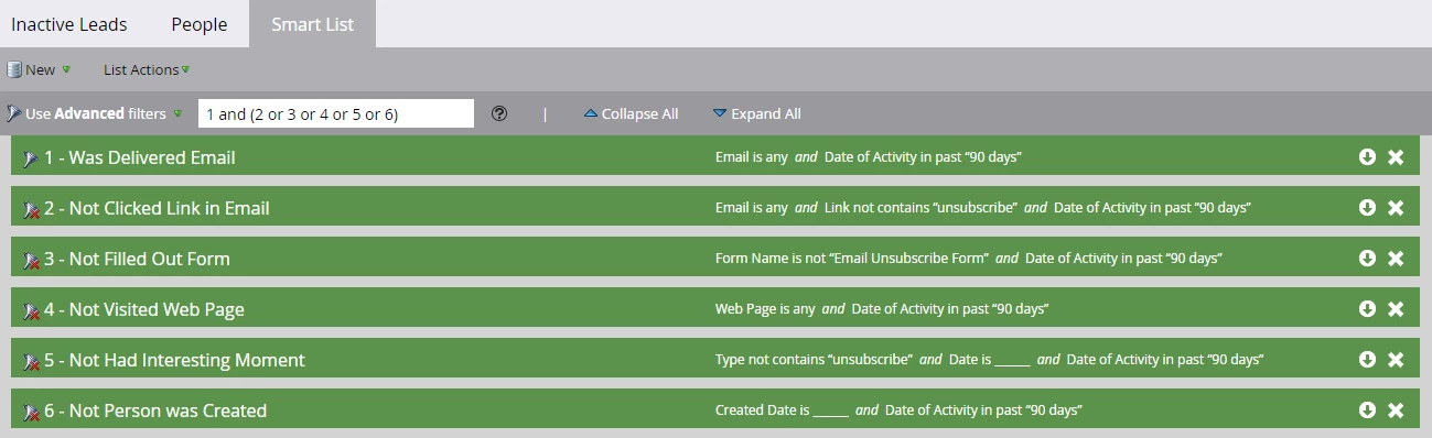 - Inferring from the above smart lists and reports, you can document categories of people that can be deleted, ideally, you would want to delete: