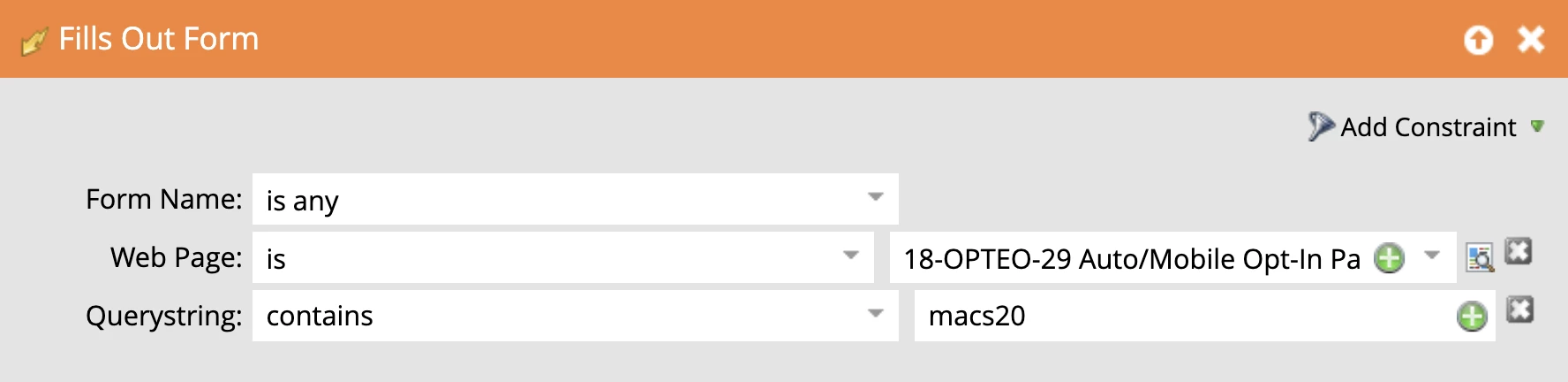 This trigger simply includes the general landing page that was created to capture opt-ins, along with the specific query string attributed to this source.