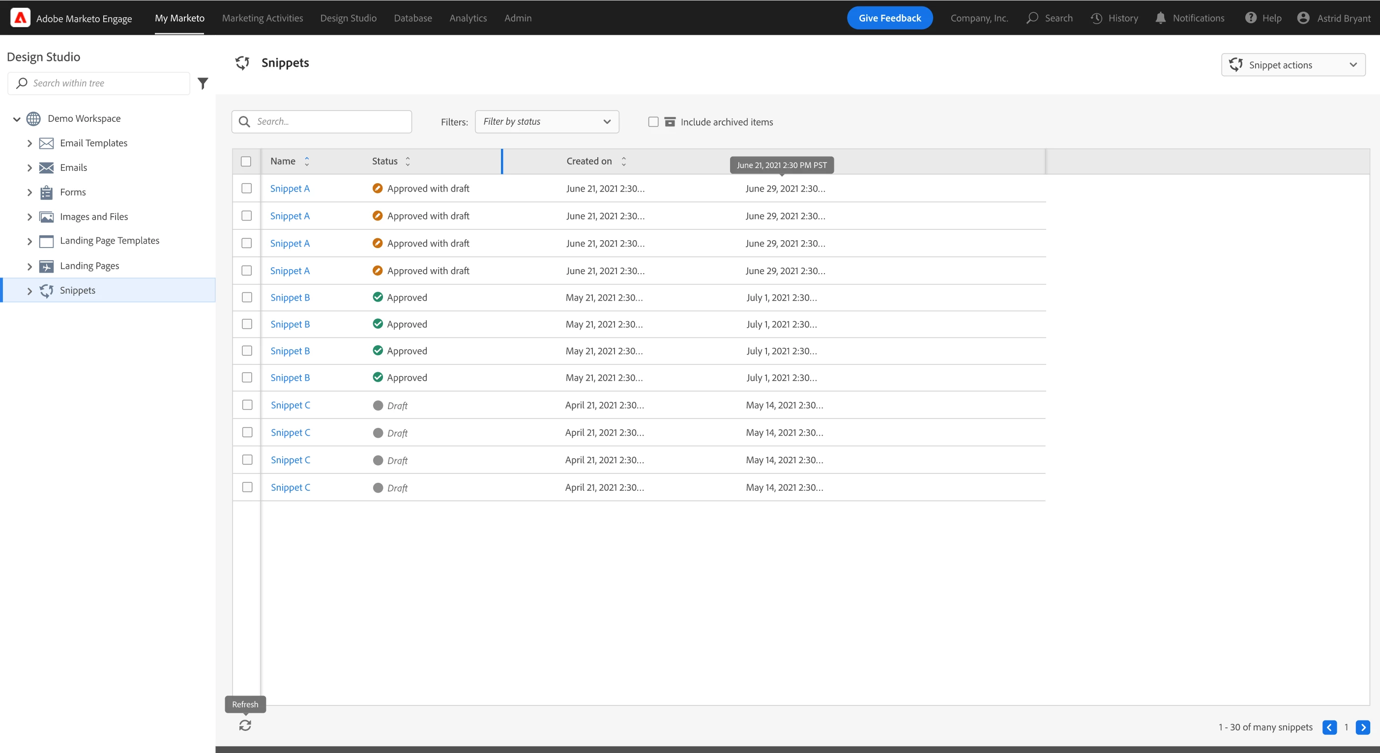 From Jan 2023 release, Marketo Customers would be able to get a glimpse of Marketo’s next generation experience for Snippet list view. Marketers will be able to discover Snippet list view with a brand new experience to enhance usability through uncluttered view as well as perform bulk actions on multiple snippet assets. A toggle switch placed at the bottom of the screen will help with the transition from old experience to the new experience and vice-versa in order to avoid losing context and help retain the changes. Users will be able to obtain a comprehensive view of all the snippets, perform quick actions and use filters to shortlist relevant snippets based on name, status and archival state.
