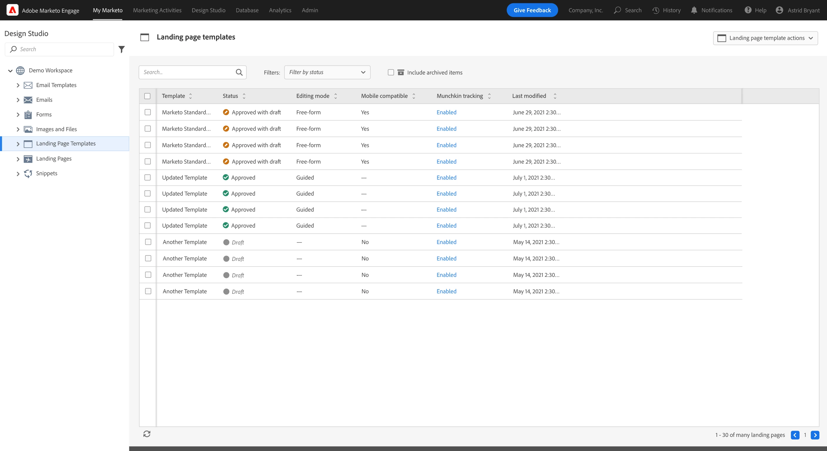 Marketo Engage New Experience: Snippet List View and Landing Page Template List View