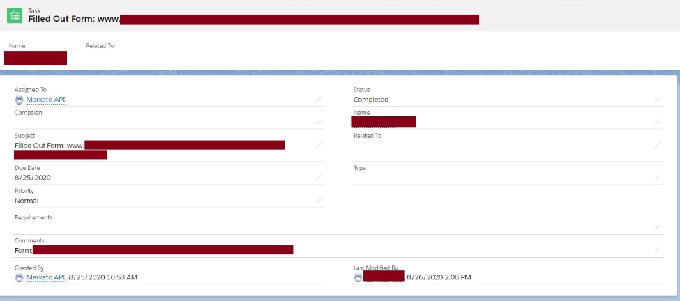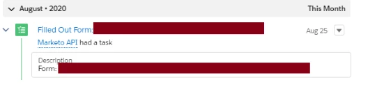 My question is, "Is it possible to push over the actual form field responses somehow in this task record?" We have many forms, from trade shows, webinars, etc., and while we send an alert with all the form fill responses to the SDR, there's no simple way to display this in the SFDC record, especially when there could be more than one form fill over the course of the lead lifecycle, and, form fields get overwritten. I thought that it might be very helpful if, whenever someone fills out a form, instead of writing over fields and making all the form fill fields exposed on the lead record, why not have Marketo push over details of the responses if we are already pushing over activities?