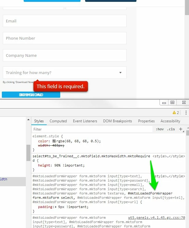 While it makes sense in some cases to use the #mktoLoadedFormWrapper as the 'high-level' target for the CSS, it also creates a constraint that these styles will only apply to forms which are placed into that container. If that's the only form container you use, it shouldn't matter -- but if you wanted to override those styles, they'd have to be "more descriptive" (i.e. even higher-level container at the front) than the highlighted CSS rule OR they could have the exact same selector (#mktoLoadedFormWrapper form.mktoForm select) but the new CSS rule would have to be written after (below) this on the stylesheet.