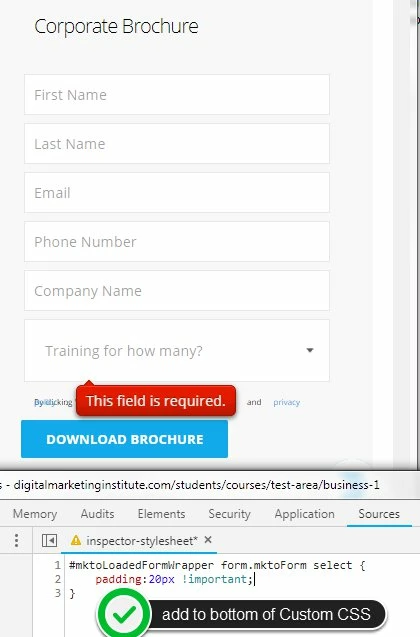 here's a snapshot of the CSS that's active (bold) on the select element. You can find this by using the "inspect" option in Chrome on any element on the page. This shows the different things that are going on in the page - in this case the rendered CSS. This is my best friend when debugging forms b/c you can see the "output" and source of things easily. The way this CSS is written, it's targeting the parent element (container) of the <form class="mktoForm" ..> element which contains the <select> element. Good news is that it looks like these styles are written into the custom CSS on your form. If you wanted to change just the select padding, you could use this code at the bottom of the Custom CSS on your form to override the padding (dont forget the !important flag).