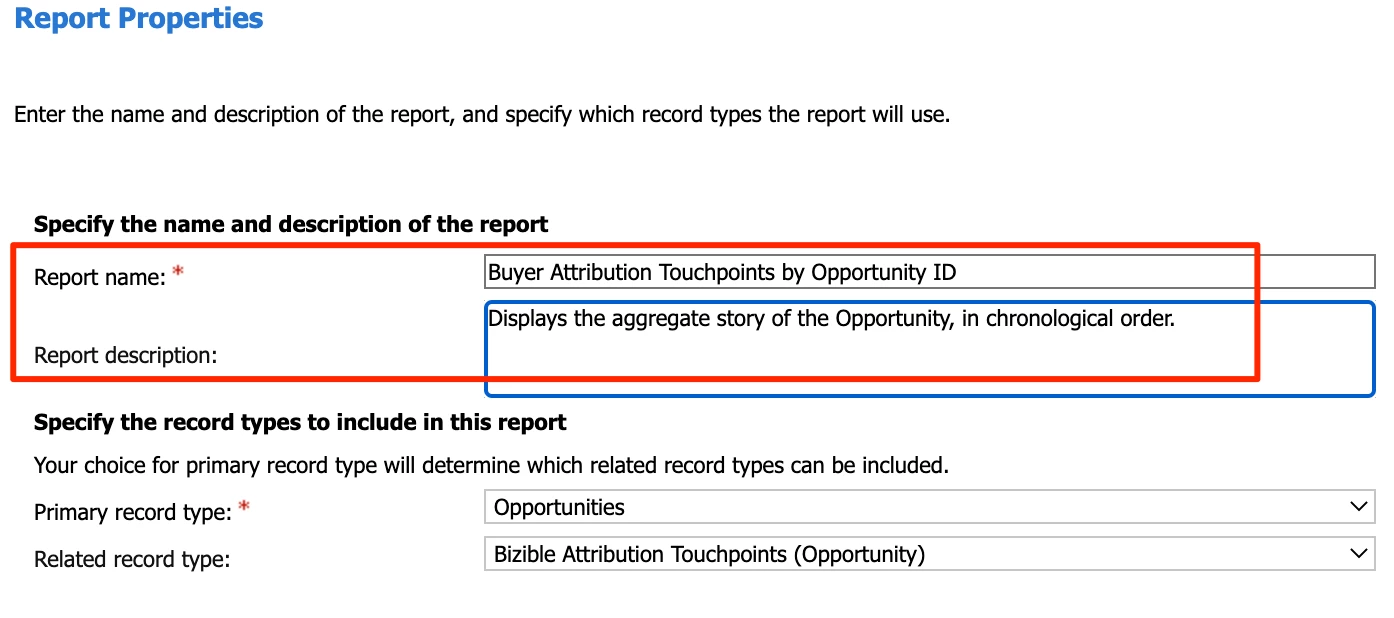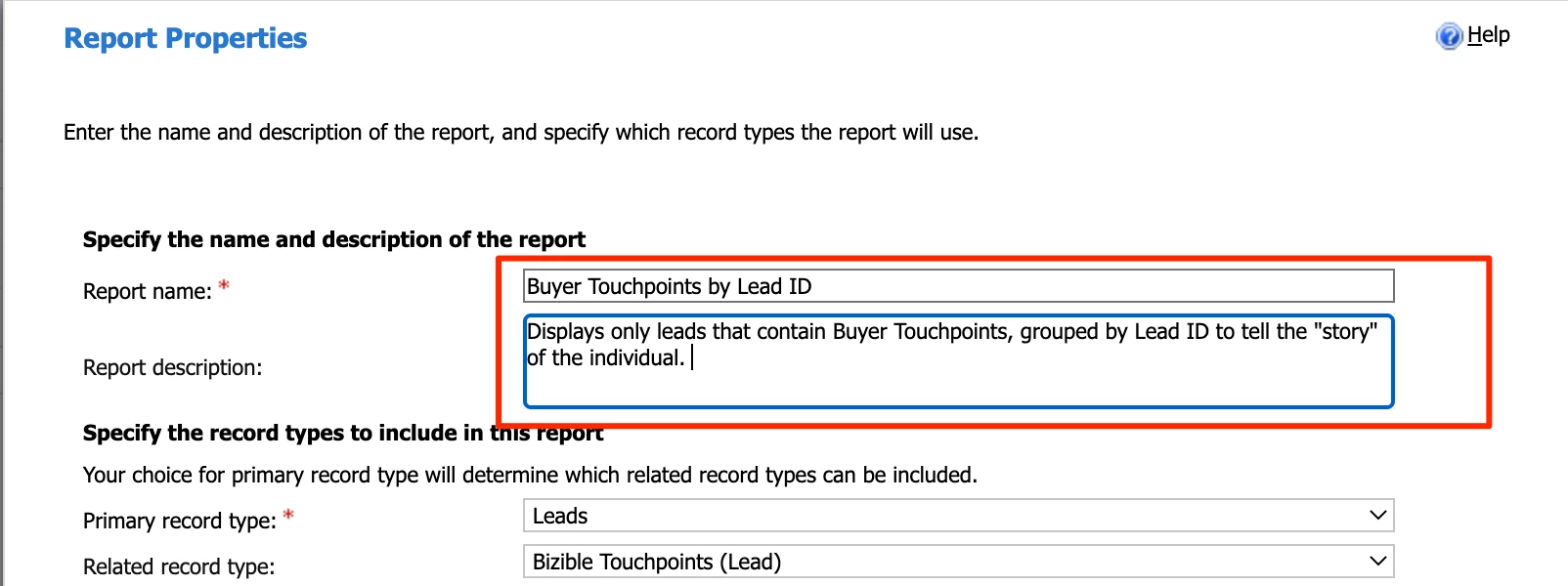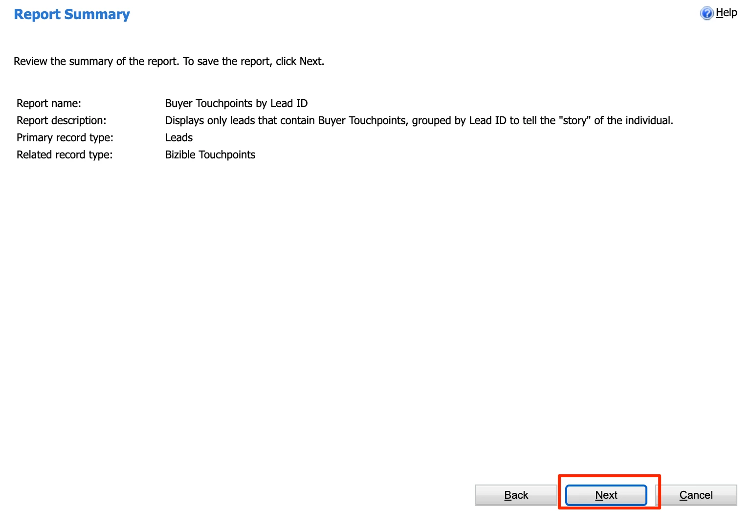 Give the report a name, I recommend “Buyer Touchpoints by Lead ID.”