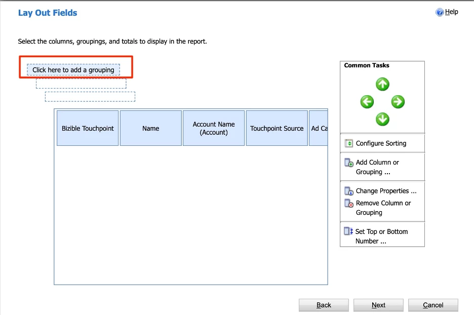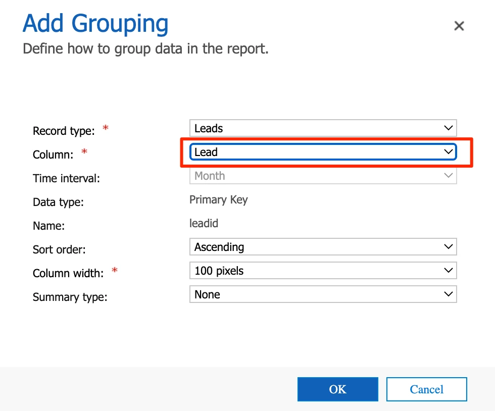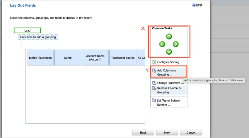 We’ll do one together, so click “Add Column or Grouping.” Then make the following adjustment: