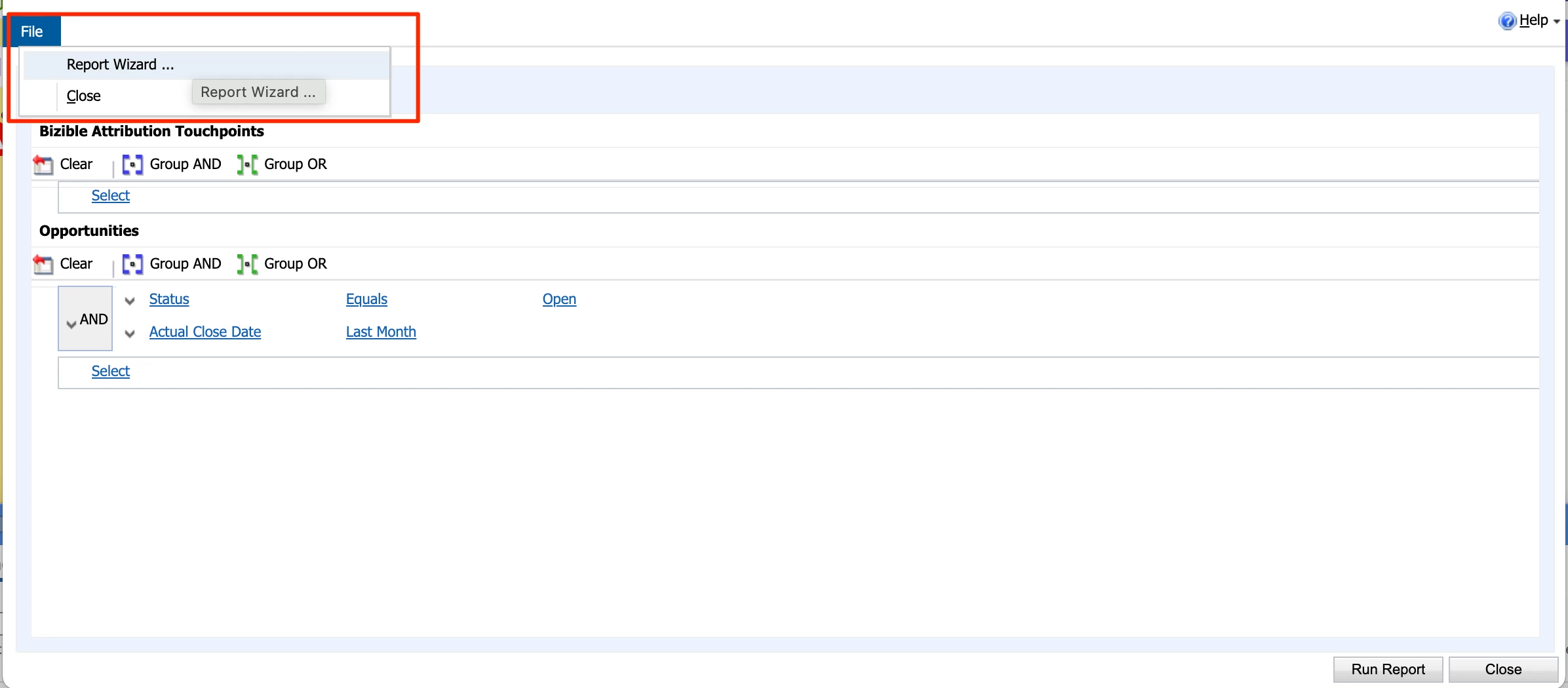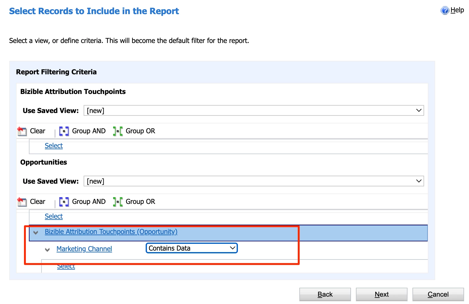 Make the following adjustments on the next window to ensure that only Opportunities that do have Buyer Attribution Touchpoints show up on the report. Note that this is also where you’d do any other filtering wanted (Opp Type, Opp Stage/Status, Date range, etc.).
