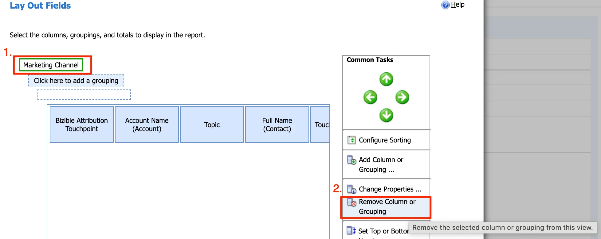 Next, remove the existing grouping by clicking onto “Marketing Channel” and then clicking the button to “Remove Column or Grouping”: