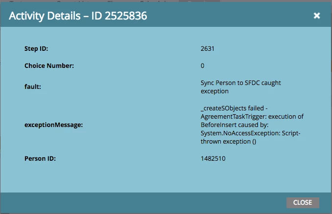While trying to sync MQL to SFDC, its getting failed with an error message "_createSObjects failed - AgreementTaskTrigger: execution of BeforeInsert caused by: System.NoAccessException: Script-thrown exception ()"