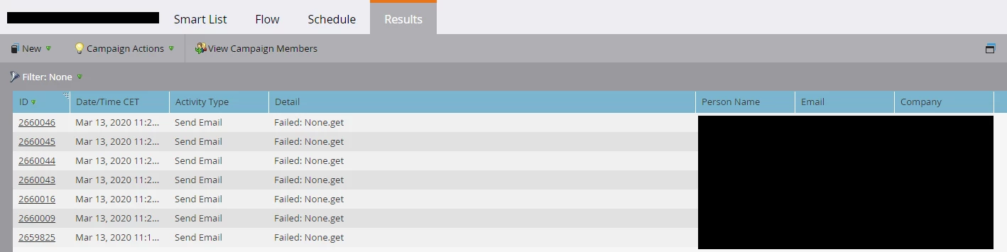 Our team has created a Smart Campaign to send out emails, based on several simple choices. Although the Smart Campaign seems to work, Marketo raises a 'Failed: None.get' error for the 'Send Email' flowstep: