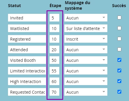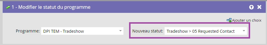 En parlant de statuts, ceux-ci ne sont pas seulement utiles pour le suivi de l’activité. Vous pouvez également déclencher des changements de statut pour des campagnes opérationnelles importantes comme le scoring et le lead sourcing. Par exemple, si le statut d’une personne change en Participant dans un programme dont le nom commence par « TS— » (vous vous rappelez que nous avons discuté des conventions d’appellation ?), vous pouvez envisager de lui donner des points pour avoir visité votre stand au salon.
