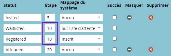 Les personnes peuvent, cependant, aller et venir entre les statuts avec le même numéro d’étape. Ceci est utile lorsqu’un enregistrement est destiné à passer d’un statut à l’autre au lieu de progresser.