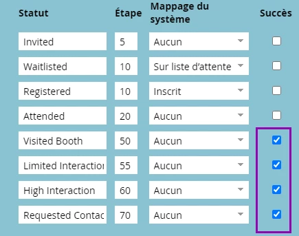 Pour revenir à notre exemple de canal de webinaire, vous pouvez décider qu’un webinaire est réussi lorsqu’un nombre X de personnes ont le statut Participant ou Participant à la demande. Lorsque vous exécuterez vos rapports, vous serez alors en mesure de répondre rapidement à la question : « Ce programme valait-il mon temps et mon argent ? »