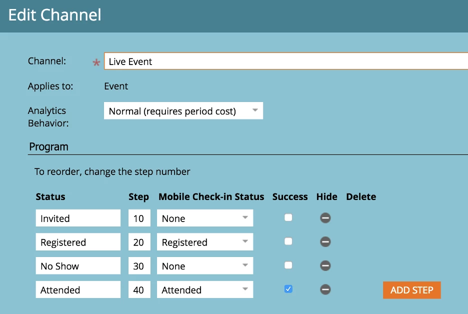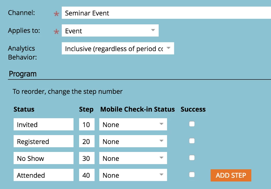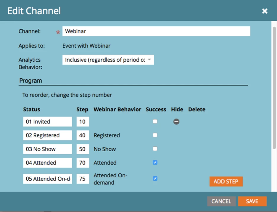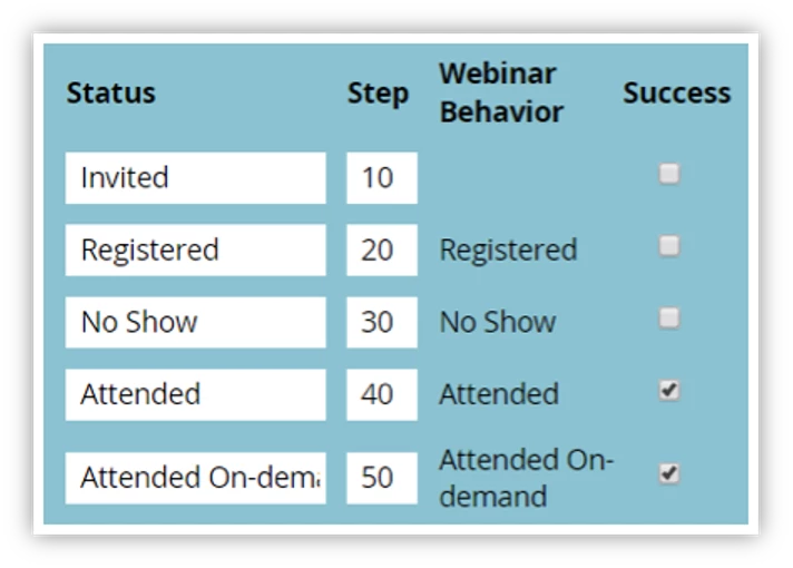 Here’s an example: For the webinar channel, we have set up the statuses and the successes shown below.
