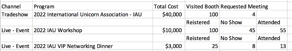 When aggregating all your Live Events, it might look something like this where your tradeshow periphery events would be intermingled with your other live events that field marketing carries out or other tradeshow periphery events.