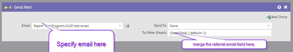 We are setting up a smart campaign to send an email to an email address that lives on an opportunity field in Salesforce. In order to do this, I set up a velocity script token to pull the email address from SF and will use a "send alert" flow step to send the actual email.