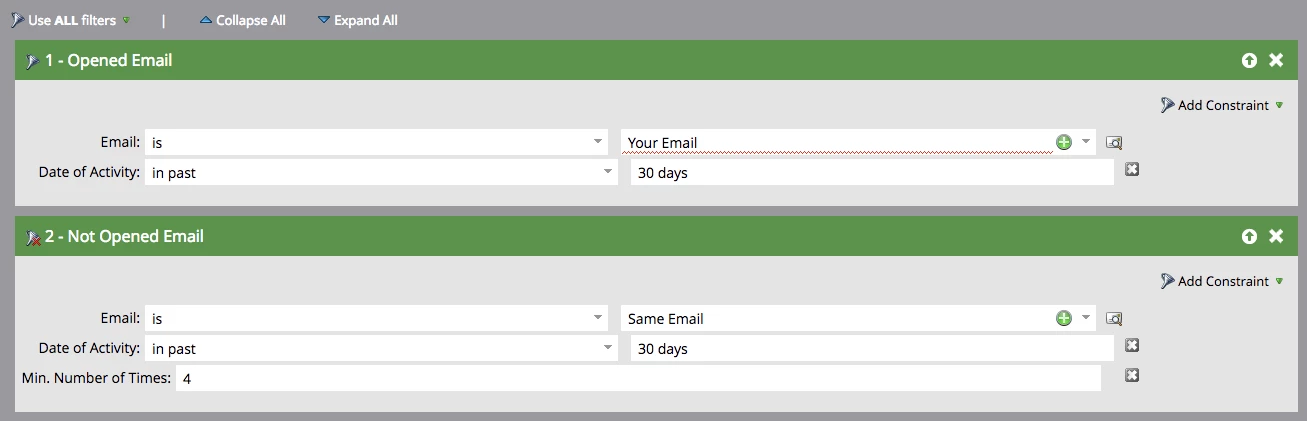 If you apply these two together it should work, just make sure to reference the same email, in the same timespan, with both filters applied either through ALL Filters or (1 and 2) in Advanced Filtering.