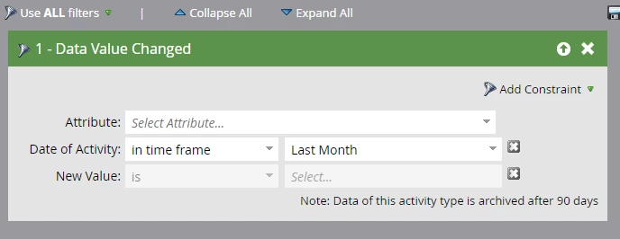- If you want to know the number of people who moved to a specific status in the last month use the filter "Data Value Changed". Seen below and just set Attribute= Lead status, New Value= the status you are looking at (i.e. MQL, MAL). There is also a "Score was Changed" filter if you want to base it on Lead Score instead.