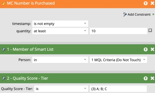 The smart list of each of these campaigns will check that the person meets our MQL criteria and that they have the correct Marketo lead score for the priority of this activity. For example, purchasing 10 phone numbers has a priority of “Important” meaning that only leads with a Marketo lead score of A-C (or Low-Top Match) should qualify for this campaign.