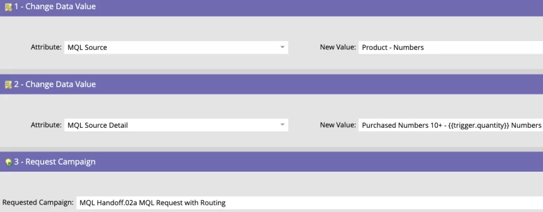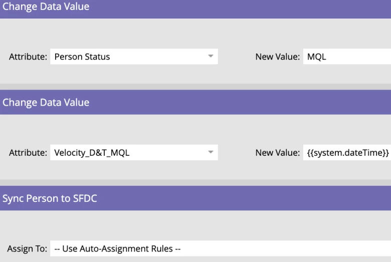 Once the MQL Source and MQL Source Detail fields have been set, each and every campaign then requests the same “MQL Request with Routing” campaign to set the necessary fields for someone to MQL e.g. Person Status and Velocity_D&T_MQL, before syncing the person to Salesforce so the sales team can reach out to them.