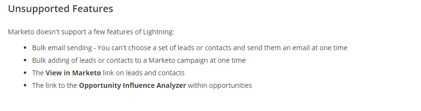 Marketo button with the MSI and MSE package is not supported by SFDC Lightning because they are javascript based. This means the buttons will not appear when using the Lighting UI in SFDC. Does anyone know of a workaround until Marketo addresses this issue? I know our users can change their UI back to the SFDC classic UI and use the buttons, but that's not the ideal situation. Our users would prefer to say within one UI.