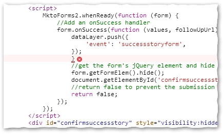 I am trying to have 2 functions execute onsuccess. One is to hide the form and show a thank you message, which we already have working. We want an additional function to send a GA event so GTM can fire additional scripts.