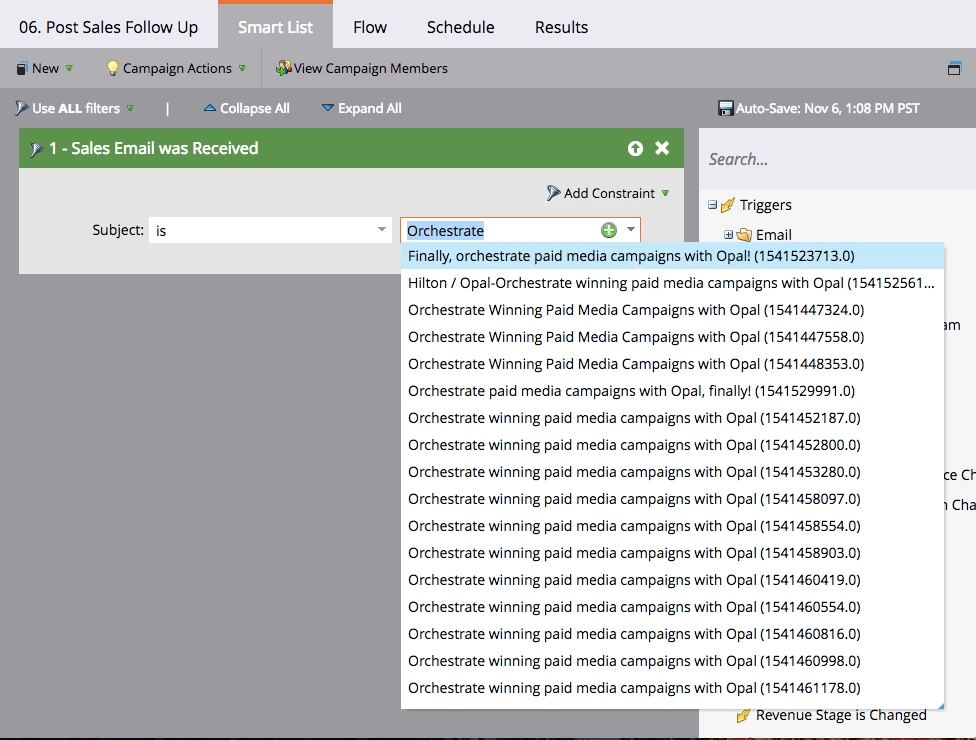 I had planned to define my Smart List by using the filter of "Sales Email Was Received" and then entering the Subject of my MSI email. However, when I go to enter the email Marketo is showing me one email for every MSI email sent out of SFDC. Marketo Support could not answer me as to why a new email was being created with each send. Support suggested that I just choose all emails to capture everyone who was sent an MSI email. However, when I do that, the Smart List yields zero people.