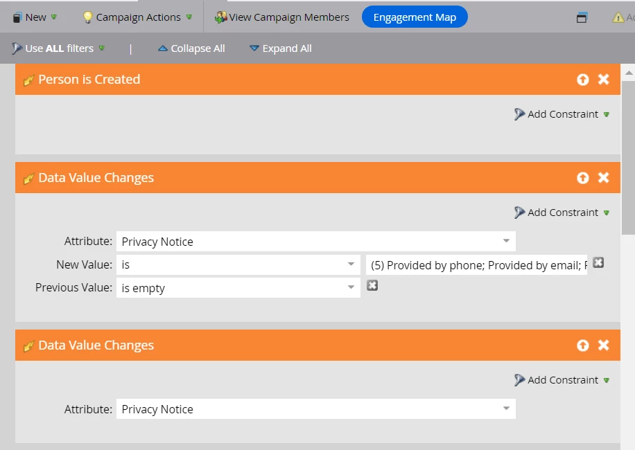 Problem: There is one trigger campaign created at the operational level which triggers when the Privacy Notice value gets updated and it changes the Privacy Notice date to be {{system.date}}. However, I created my trigger campaign (which includes the triggers for Marketing Consent, Marketing Consent Event date, Privacy Notice, Privacy Notice Given date triggers and filters) and set the priority as "High" so that I can override the already created trigger, and set the dates to be {{system.date}} + 1days in the flow step as can be seen in the snapshot below: