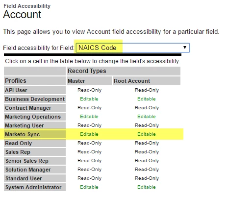 I would like to use NAICS code for demographic scoring in Marketo, as some industries are more valuable to our sales team than others. Unfortunately, despite giving the Marketo sync edit access to the fields NAICS Code and NAICS Description,they are not present in Marketo. Any thoughts how to get the field in Marketo? Attached are screenshots of salesforce permissions for each code.