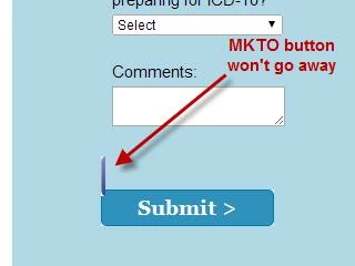 I have been using the code below to easily update our form buttons to fancy buttons for nearly a year. I've found on a new page that the MKTO button is still showing up. MKTO provided the original fancy button code, but that throws all of my page's elements out of whack. The header goes to the top of the page, the sub head where the heading should be, etc. Does anyone know how to completely hide the button, possibly using the code below? We can't use forms 2.0 because our customers and internal users all still use IE8 and there are issues with the page not progressing after a form submission in IE8.