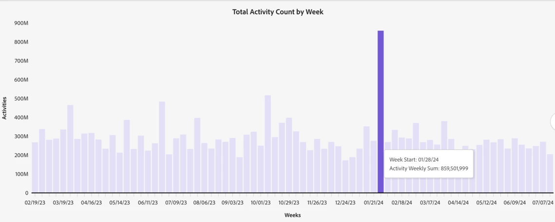 This Dashboard will provide a view into a customer’s overall average weekly Activity Usage over a 52-week time period. Daily Activity data is aggregated into weekly buckets and presented in an easy to ready bar chart. A custom date range selection will be added in future releases.